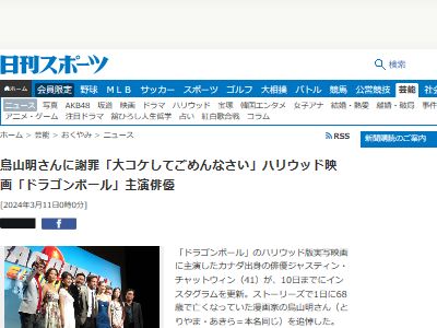 鳥山明さんに謝罪「大コケしてごめんなさい」ハリウッド映画「ドラゴンボール」主演俳優