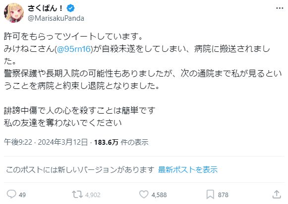 みけねこさん(@95rn16)が自殺未遂をしてしまい、病院に搬送されました。