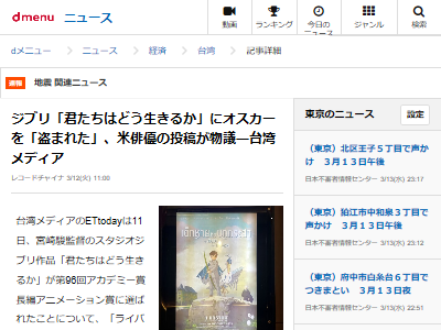 台湾メディアのETtodayは11日、宮崎駿監督のスタジオジブリ作品「君たちはどう生きるか」が第96回アカデミー賞長編アニメーション賞に選ばれたことについて、「ライバル」の発言が物議を醸したと伝えた。