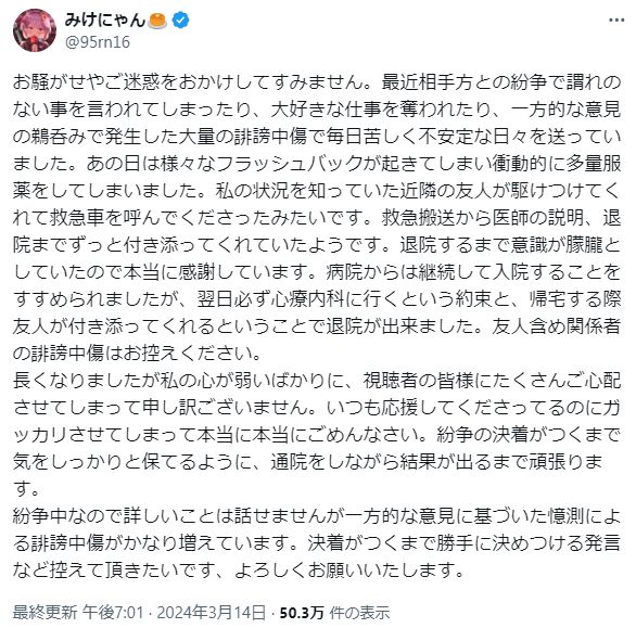 ![图片[1]-自殺未遂をしたみけねこさん、長文お気持ち表明「紛争中に一方的な意見を鵜呑みにされ、誹謗中傷された」「毎日苦しくて多量服薬をしてしまった」-同舟](https://zb.amz114.top/wp-content/uploads/2024/03/frc-898096e8b021987516fbe999ea55a547.jpg)