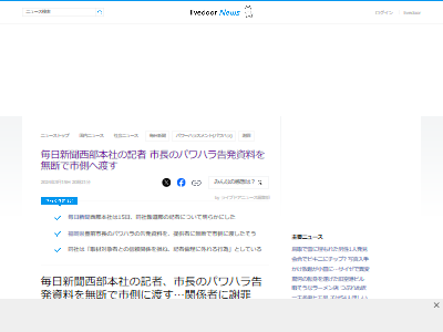 毎日新聞西部本社(北九州市)は15日、同社報道部の記者が、福岡県豊前市の後藤元秀市長による市職員へのパワーハラスメント(パワハラ)行為を告発する資料を入手後、提供者に無断で市側に渡していたことを明らかにした。