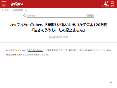 カップルYouTuber、5年間リボ払いに気づかず借金120万円 「泣きそうやし、ため息止まらん」