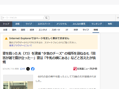 妻を殴った夫(73)を逮捕 “夕食のチーズ” の場所を尋ねるも「回答が雑で腹が立った…」妻は「牛乳の横にある」などと答えたが憤慨