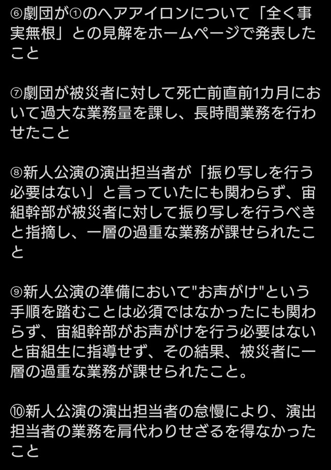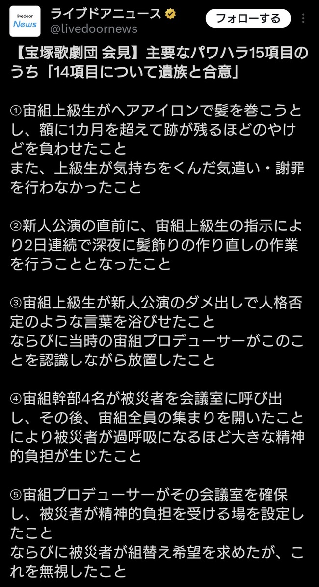 宝塚歌劇団員死亡で、一転、パワハラ認める。歌劇団側が遺族に謝罪。遺族側が公表。主要なパワハラ15項目のうち「14項目について遺族と合意」とのこと。 pic.twitter.com/mcth61EYSq