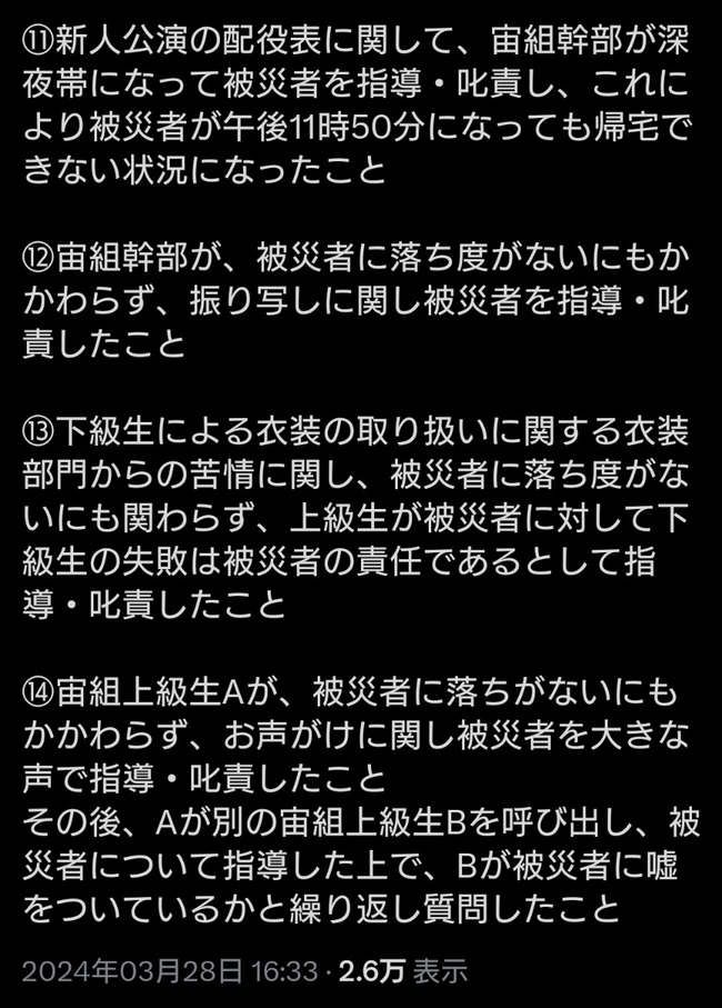 宝塚歌劇団員死亡で、一転、パワハラ認める。歌劇団側が遺族に謝罪。遺族側が公表。主要なパワハラ15項目のうち「14項目について遺族と合意」とのこと。 pic.twitter.com/mcth61EYSq— 田中伸幸@tanakas.eth (@name6less9) March 28, 2024