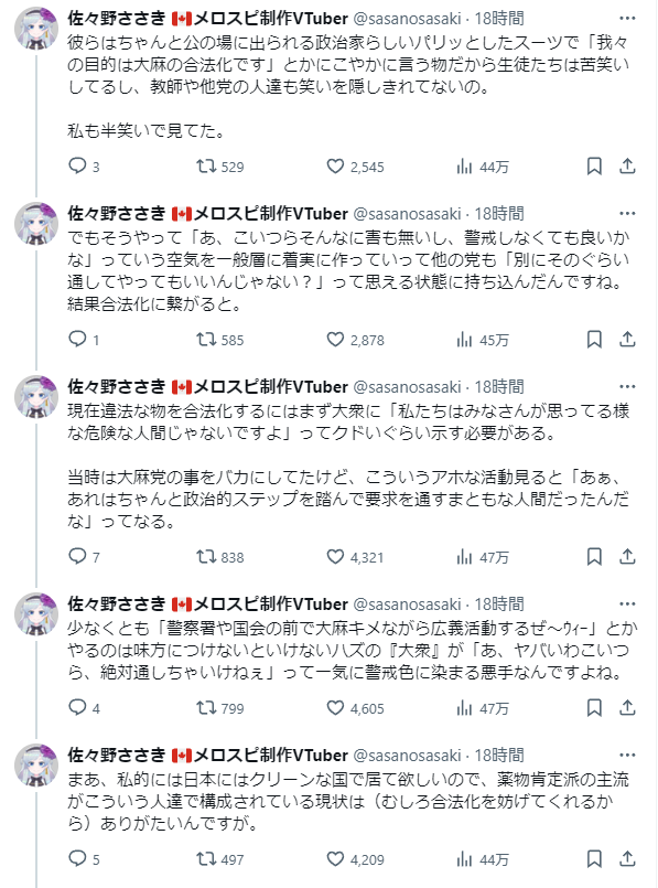 コレ見て支持するの、元から大麻合法化を言ってる層だけで、大麻合法化に懐疑的な大多数の人からは敬遠されるだけだわ https://t.co/LfzXHTqVZ7