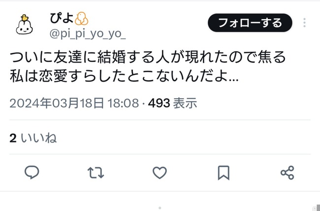 恋愛したことないのは別にいいとして、結婚する人が現れたことに対してのこのリアクション、交友関係の乏しさからして、人格形成に必要なコミュニケーションを取ってこなかった人間だというのが窺える。
