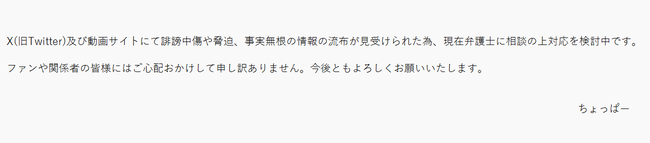 疑いの目が向けられる中、ちょっぱーは2日に自身のXを更新。
