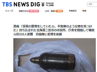 速報 「実家の整理をしていたら、不発弾のような物を見つけた」持ち込まれた北海道三笠市の市役所、庁舎を閉鎖して職員ら約220人避難 自衛隊に処理を依頼