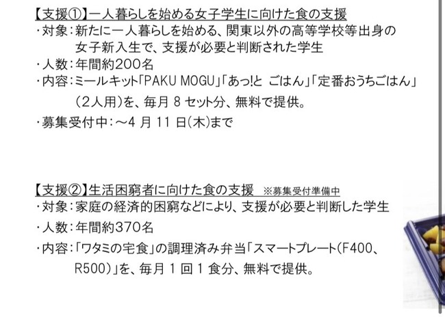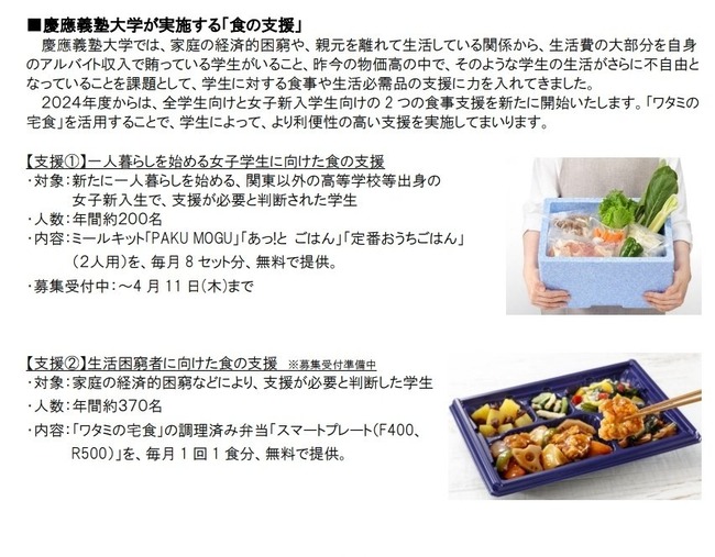 ワタミと慶應義塾大学が学生への食事支援を開始−経済的困窮や一人暮らしにより支援が必要な学生に無料で食事をお届け−https://t.co/BUaDiZRVqP— 塾生情報局(慶應生向けメディア)#春から慶應 (@info_jukusei) April 5, 2024