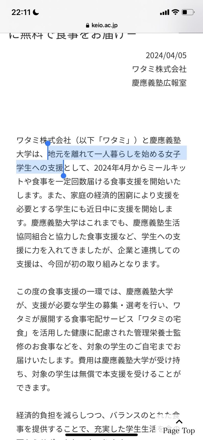 これ、どうして「女子学生のみ」なのか、茶化さずに真顔で署名集めて抗議すべきではないでしょうか。所得調査もなく、多くの豊かな女子学生の食費を、慶応とはいえ中にはいるであろう貧困な男子学生の学費で補償するのは、どう考えてもおかしいでしょう。 https://t.co/RkhQiCqA3b