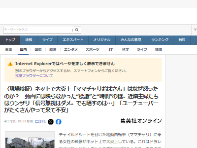 チャイルドシートを付けた電動自転車(ママチャリ)に乗る女性の映像がネット上で大炎上している。