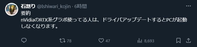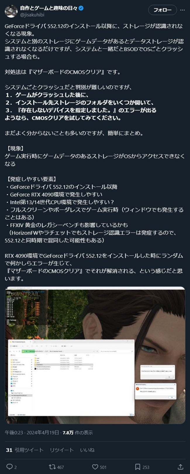 なおGeForceドライバ 552.12が原因説も時期的に混同した可能性はあります。