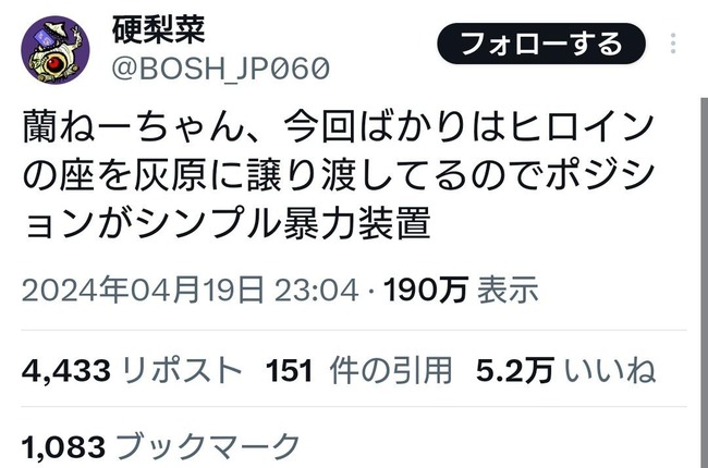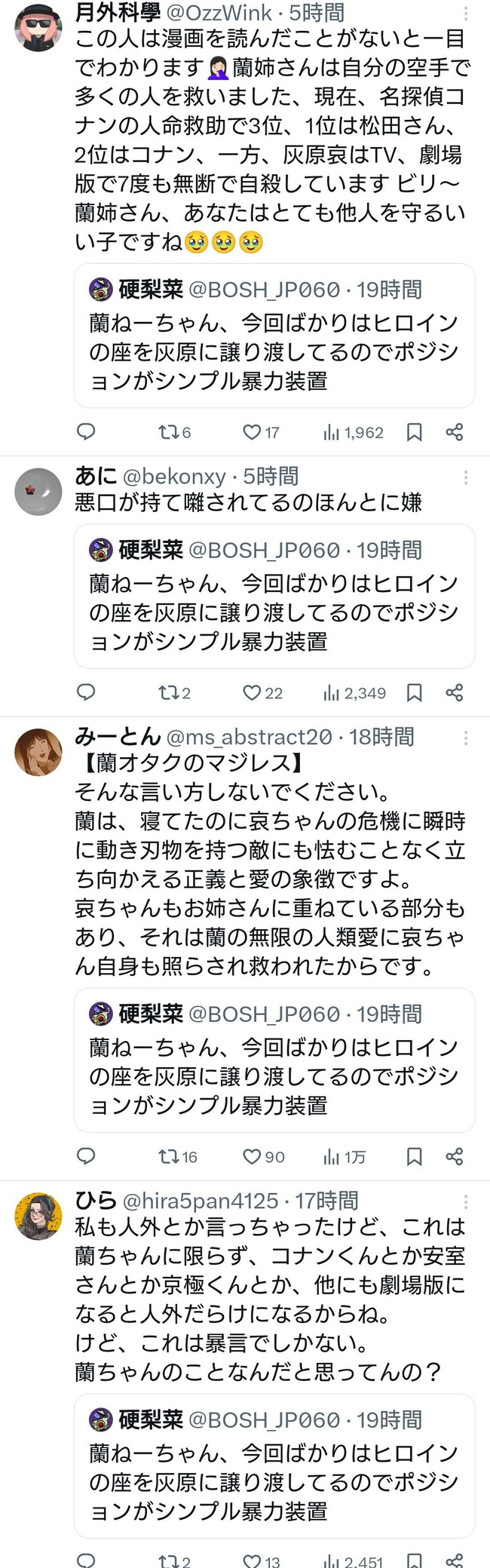 シャンフロ作者さん、コナンの蘭ねーちゃんを「暴力装置」呼ばわりしてしまい炎上へ・・・momo5个月前发布关注私信02410 Xより アニメ化もした、マガジン連載中、なろう発の人気作品『シャングリラ・フロンティア』の作者さん コナン映画を観に行った結果・・・(※ネタバレ注意)↓ 炎上してしまう・・・ ・物語の本質に触れず ・主人公の秘密も共有せず ・絶対的な安全圏にいるヒロイン ★~☆·☆.~同舟*∴*~★ © 版权声明 版权声明 1 本网站名称:华人同舟360 3 本网站的文章部分内容可能来源于网络,仅供大家学习与参考,如有侵权,请联系站长QQ3311406980进行删除处理。 4 本站一切资源不代表本站立场,并不代表本站赞同其观点和对其真实性负责。 5 本站一律禁止以任何方式发布或转载任何违法的相关信息,访客发现请向站长举报 THE END在日趣闻 喜欢就支持一下吧点赞10 分享QQ空间微博QQ好友海报分享复制链接收藏