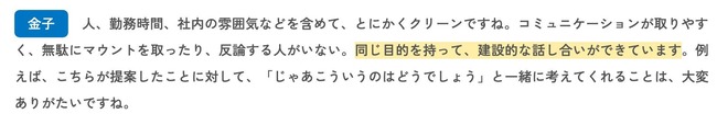 >コミュニケーションが取りやすく、無駄にマウントを取ったり、反論する人がいない。同じ目的を持って、建設的な話し合いができています。