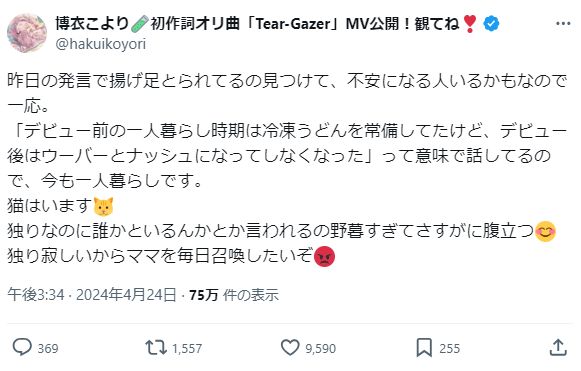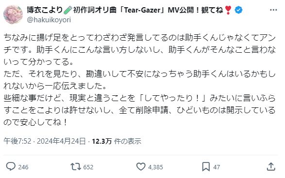 ただ、それを見たり、勘違いして不安になっちゃう助手くんはいるかもしれないから一応伝えました。…— 博衣こより🧪初作詞オリ曲「Tear-Gazer」MV公開!観てね❣️ (@hakuikoyori) April 24, 2024