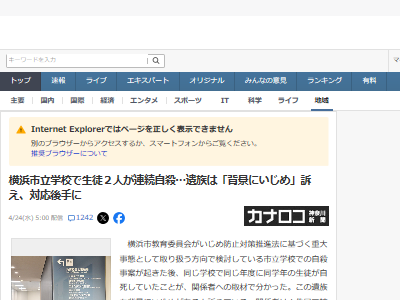 横浜市立学校で生徒2人が連続自殺…遺族は「背景にいじめ」訴え、対応後手に(カナロコ by 神奈川新聞) – Yahoo!ニュース