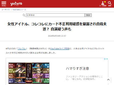 女性アイドル、コレコレにカード不正利用疑惑を暴露され自殺未遂? 自演疑う声も – YouTubeニュース | ユーチュラ