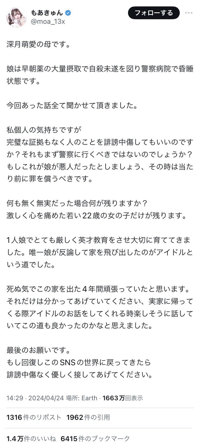 そして母親を名乗る人物が「早朝薬の大量摂取で自殺未遂を図り警察病院で昏睡状態」と