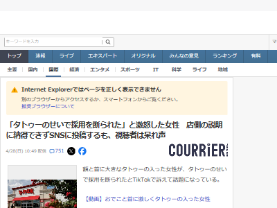 「タトゥーのせいで採用を断られた」と激怒した女性 店側の説明に納得できずSNSに投稿するも、視聴者は呆れ声