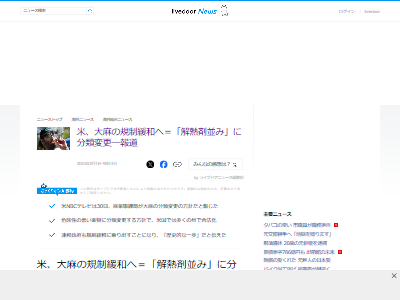 アメリカの大麻規制、◯◯並みに分類変更されてしまう模様・・・ひかり参上2个月前发布关注私信02212 米、大麻の規制緩和へ=「解熱剤並み」に分類変更―報道 米NBCテレビは30日、麻薬取締局(DEA)が大麻を危険性の低い薬物に分類変更する方針だと報じた。 米国では既に多くの州で大麻が合法化されているが、連邦政府も規制緩和に乗り出すことになり、NBCは「歴史的な一歩」だと伝えている。 現在、大麻は乱用の可能性が最も高い「1類」に指定されている。 DEAはこれを一部の解熱鎮痛剤やステロイドなどと同じ「3類」に変更する見通しだ。 ★~☆·☆.~同舟*∴*~★ © 版权声明 版权声明 1 本网站名称:华人同舟360 3 本网站的文章部分内容可能来源于网络,仅供大家学习与参考,如有侵权,请联系站长QQ3311406980进行删除处理。 4 本站一切资源不代表本站立场,并不代表本站赞同其观点和对其真实性负责。 5 本站一律禁止以任何方式发布或转载任何违法的相关信息,访客发现请向站长举报 THE END在日趣闻 喜欢就支持一下吧点赞12 分享QQ空间微博QQ好友海报分享复制链接收藏