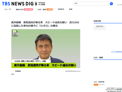 武井俊輔 衆院議員が乗る車 スピード違反の疑い 自らSNSに投稿した車内の様子に「91キロ」の表示