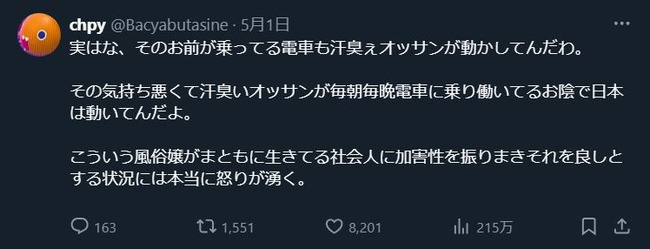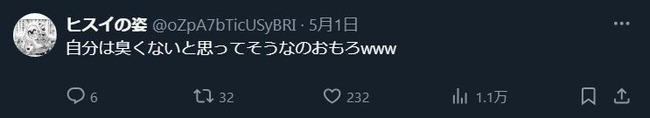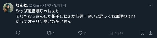 あと女が臭いなら近づかんでくれたら助かるわ!www来んな!!www https://t.co/ynyPGwqZui— とっととゲロ太郎 (@gerogero346) April 30, 2024