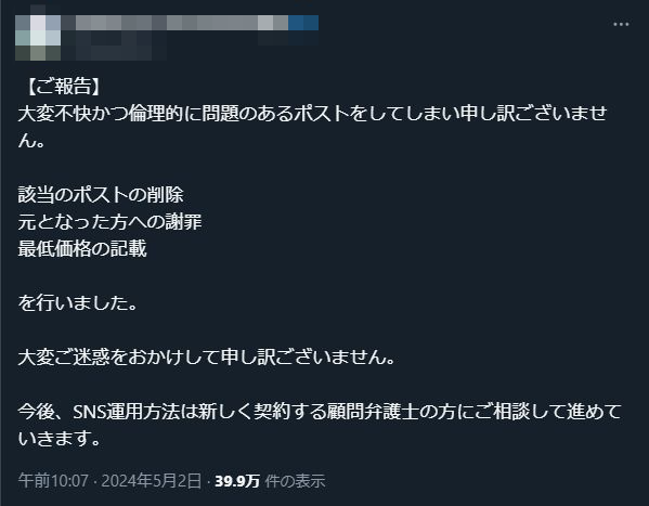MV制作者さん、ポストを削除して謝罪