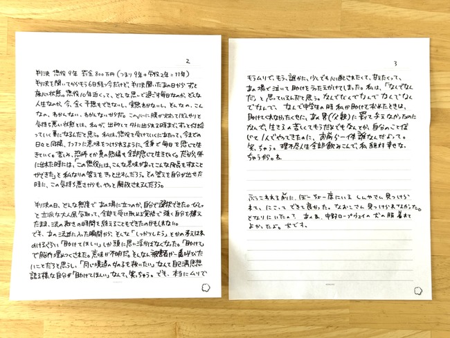 判決を聞いてからもう6日経つ今だけど、判決聞いたあの日からずっと放心状態。懲役10年近くって、どんな思いで過ごす毎日なのか、どんな人生なのか、今、全く予想もできないし、実感わかないし、そんなの、こんなの、わかんない、わかんないからだ。この、心に膜がおおってぼんやりと気持ち悪い状態とは、私が、出所して外に出られるときまで、ずっと付き合っていくことになるんだと思う。私は、懲役を受けていくにあたって、今までの日々と同様、1つ1つに意味をつけられるように、全身で毎日を感じて生きていく。苦しみ、恐怖とか負の感情も全部感じて生きていく。だから、外に出れた時には、「この懲役には、こんな意味があってこんな成長をすることができた」と私なりの答えをきっと出すんだろう。その答えを自分が出せた時に、この気持ち悪さからも、やっと解放されるんだろう。