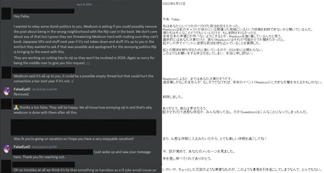これはゴシップ系VTuber FalseEyeD (所属:Mythic Talent) さんの動画内で公開された、同氏と匿名の方とのやり取りで明らかになったもの (一部抜粋) で、ANYCOLOR社が同氏の X (Twitter) への投稿内容 (NIJISANJI EN (新) タレントの立て看板の前に、FalseEyeD氏の看板を置いた写真が添付されている) の削除を行うよう圧力を加えていたことを示唆するものとなっております。