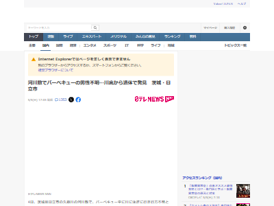 河川敷でバーベキューの男性不明…川底から遺体で発見 茨城・日立市
