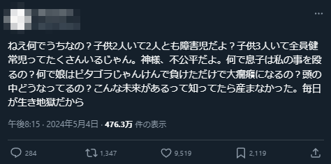 ねえ何でうちなの?子供2人いて2人とも障害児だよ?子供3人いて全員健常児ってたくさんいるじゃん。