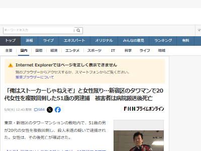 「俺はストーカーじゃねえぞ」と女性蹴り…新宿区のタワマンで20代女性を複数回刺した51歳の男逮捕 被害者は病院搬送後死亡(FNNプライムオンライン) – Yahoo!ニュース