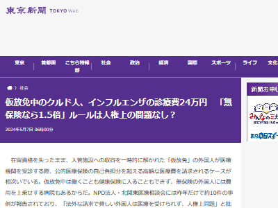 仮放免中のクルド人、インフルエンザの診療費24万円 「無保険なら1.5倍」ルールは人権上の問題なし?:東京新聞 TOKYO Web