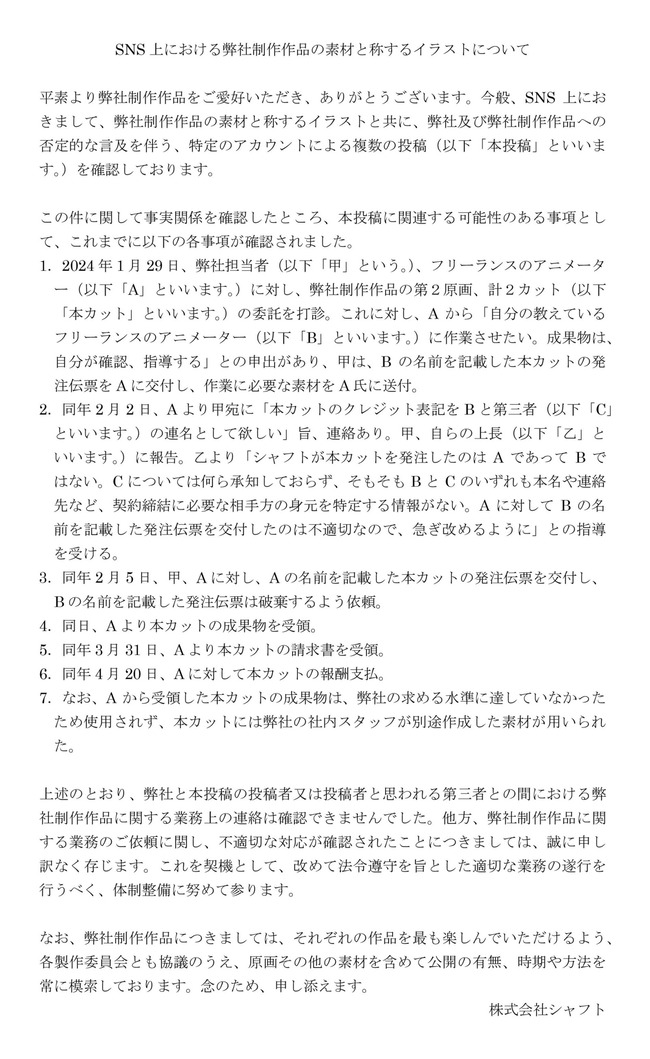 SNS上における弊社制作作品の素材と称するイラストについて pic.twitter.com/nF1bUpxZBr— シャフト (@shaft_official) May 9, 2024