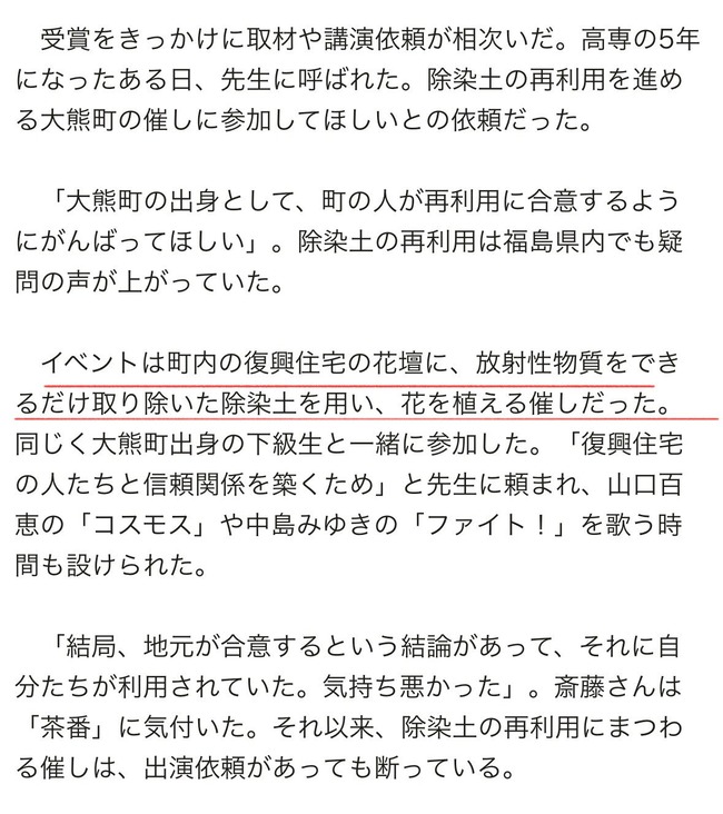 4月21日のアナザーノート「「総代で卒業の被災者」その注目がつらい 茶番に苦しんだ子どもたち」において、記事の中に誤りがありました。5年前に高専学生と大熊町住民による復興住宅のイベントの件で↓… pic.twitter.com/sWvIpC0rPi