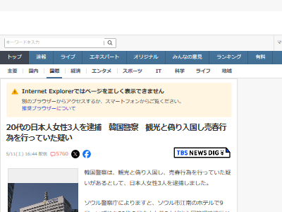 20代の日本人女性3人を逮捕 韓国警察 観光と偽り入国し売春行為を行っていた疑い(TBS NEWS DIG Powered by JNN) – Yahoo!ニュース