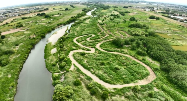 荒川河川敷に作られたレース場。過去の衛星写真では、ただバイクが走ったような細い跡だったのが、2023年くらいに全長1.5kmにも及ぶ本格的なバイクコースに変貌。許可なく勝手に作られていたという。