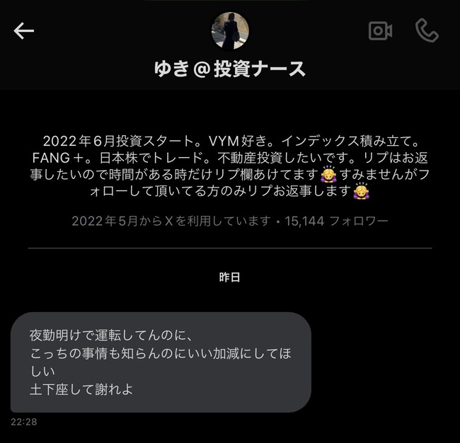 正論を言っただけなのにDMで土下座要求する投資家ナースは怖いんよ(裏震え声) pic.twitter.com/d2EReICUYK