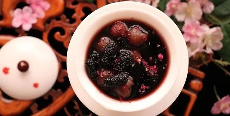 倒入桂圆干继续煮15分钟,加入桑葚干后关火焖制5分钟。