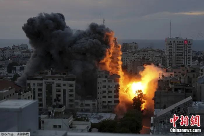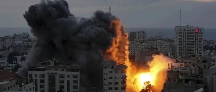 当地时间10月7日,以色列空袭加沙地带,一座巴勒斯坦公寓大楼爆炸,火球和烟雾上升。