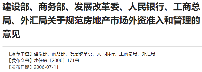 这就是在2006年7月11日发布的《关于规范房地产市场外资准入和管理的意见》: