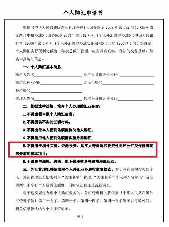 早在2017年中国更新的《个人购汇申请表》中明确写道,“不得用于境外买房、证券投资、购买人寿保险和投资性返还分红类保险等尚未开放的资本项目”。