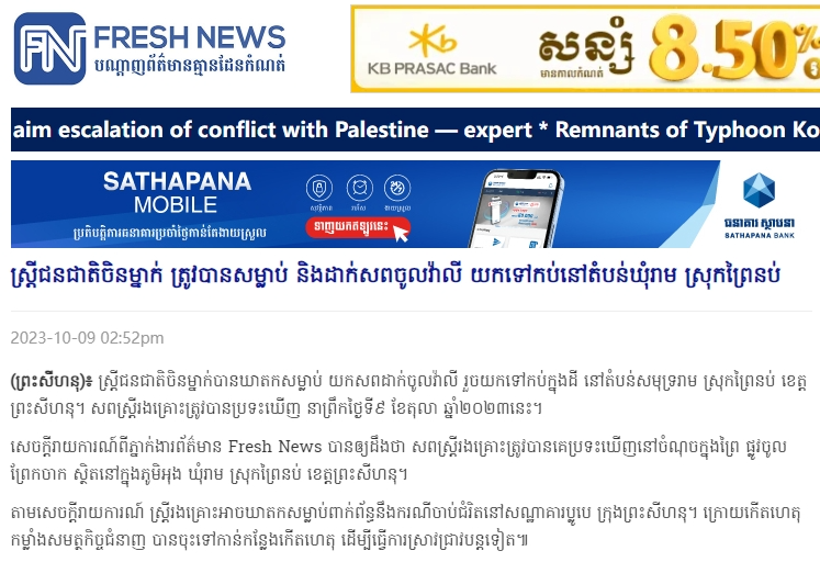 受害者的尸体在西港波礼努县Ong Ream村Prek Chak入口处的森林中被发现。