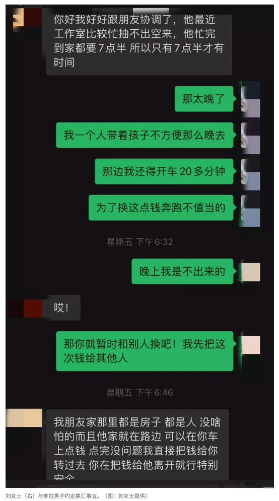 9月23日,她在一个微信换汇群,找到李姓男协商换汇。该男子表示,他刚好急需美元,可以与刘女士换汇。