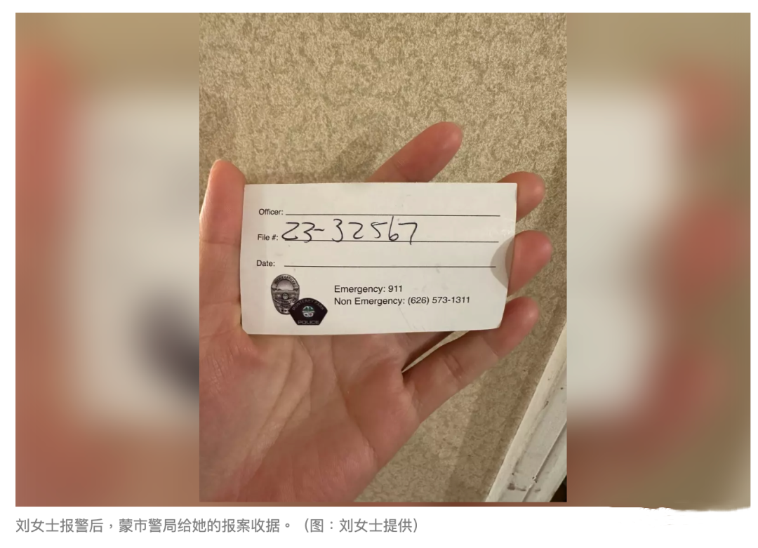 蒙特利公园市警局警员赶到现场后,询问事情前因后果。刘女士通过警员得知,附近为居民区,没有摄像监控,心都碎了。