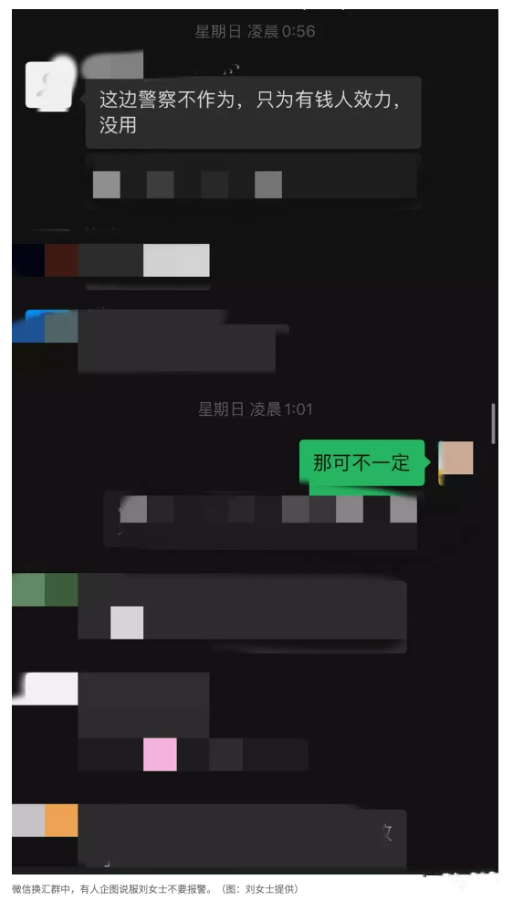 这时微信群中竟有人跳出来,说刘女士不应报警,警察只为有钱人效力,没用等话,还说出案件发生的时间、地点等细节。
