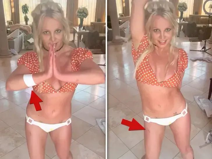 布兰妮腿上有明显的伤口,胳膊上还有类似绷带的东西。