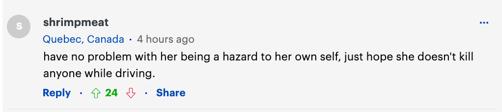我不介意她伤害自己,只是希望她在开车时不要杀死任何人。