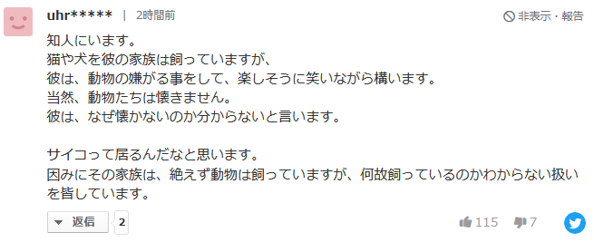 这是我认识的人。他的家人养了猫和狗,他做了让动物讨厌的事情,还会开心地笑着。当然,动物们不亲近他,他说不知道为什么不亲近。